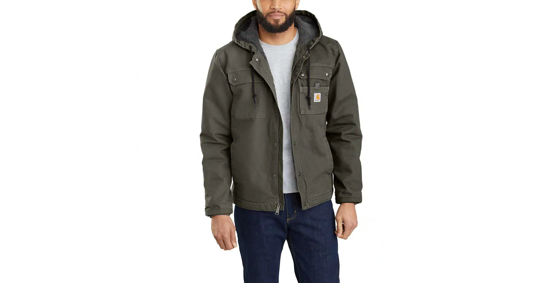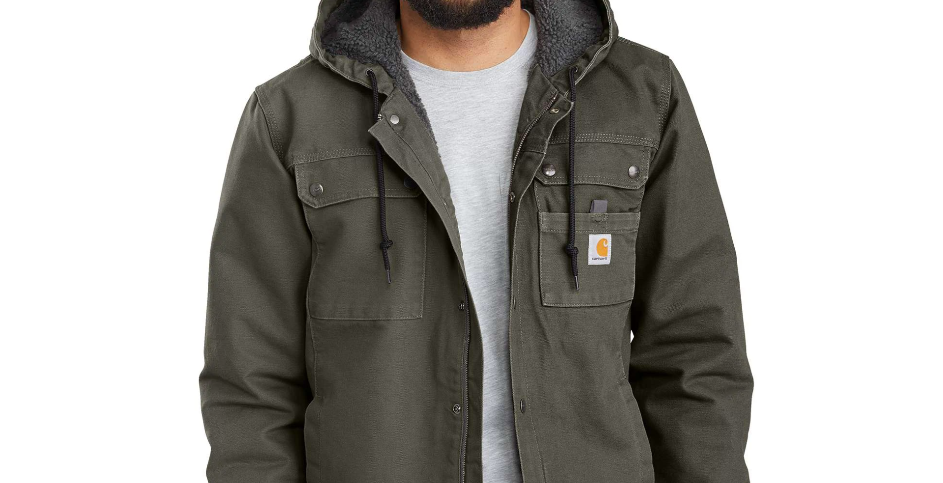 Este casaco masculina é feita para suportar o frio, o vento e os dias difíceis no trabalho. Robusta sem ser rígida, feita com algodão durável. Esta camada quente é forrada com lã sherpa macia no corpo e no capuz, com nylon acolchoado quente nas mangas.