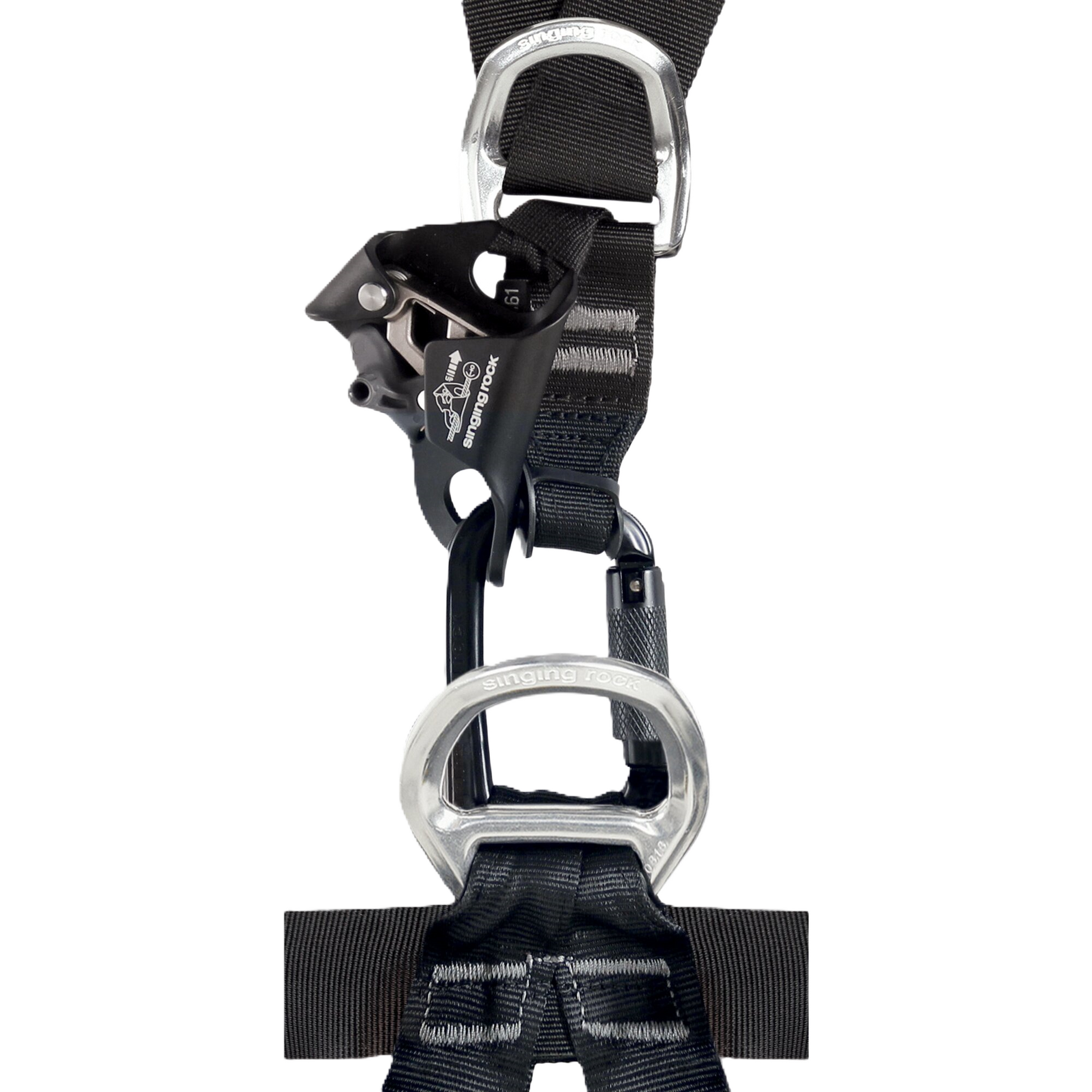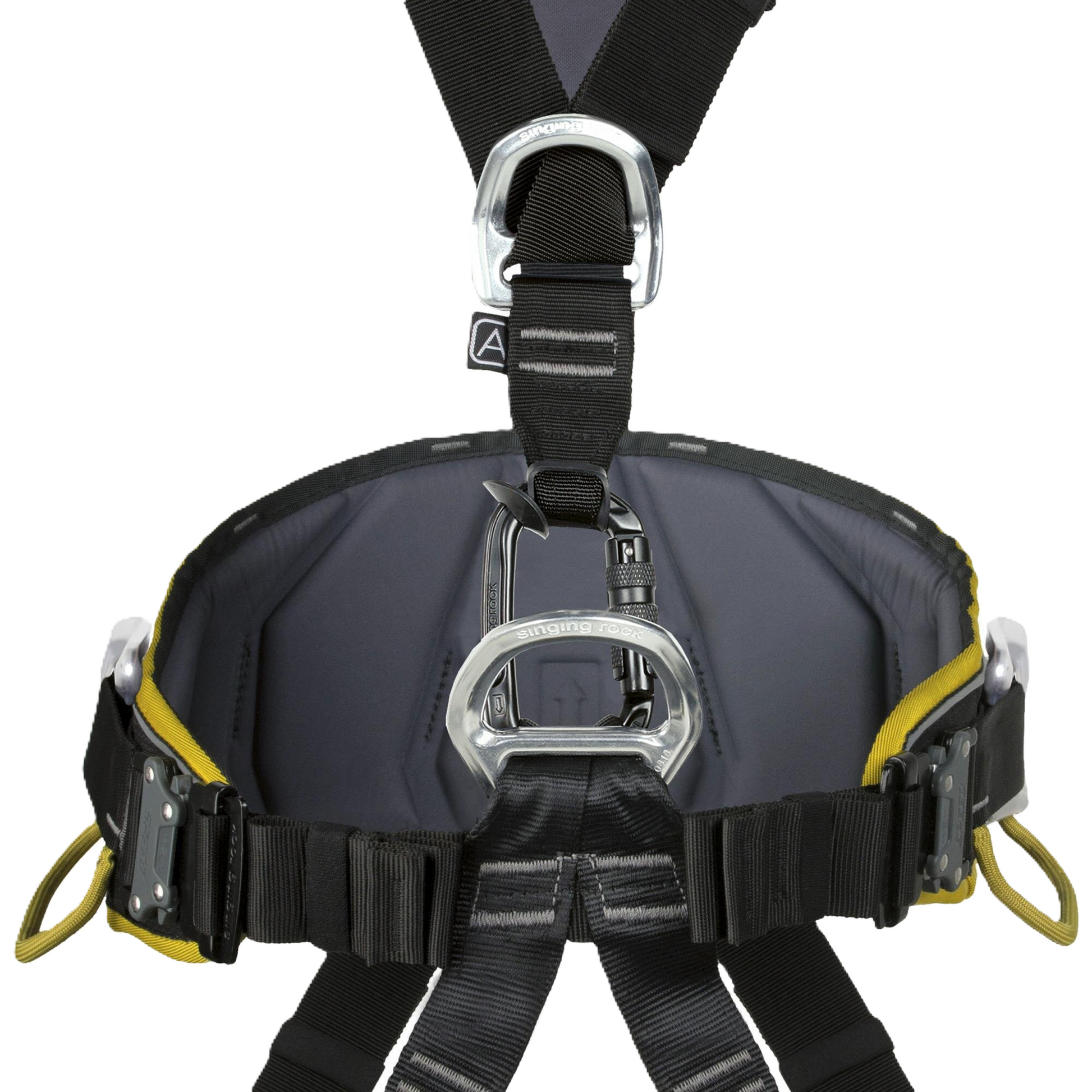 - Mosquetão OXY de trava tripla usado para conectar as alças de ombro ao ponto principal para aumentar o espaço para fixação do ascensor de peito